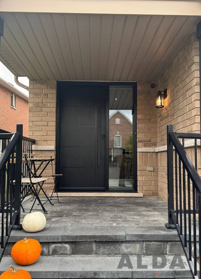 This front door was designed with everyday use in mind. Fiberglass construction offers strength and weather resistance, making it a reliable option for Canadian conditions. The wide sidelite helps brighten interior spaces and visually expands the entryway. This door is manufactured by ALDA Windows and Doors, combining bold design with practical performance for a strong, modern entrance.